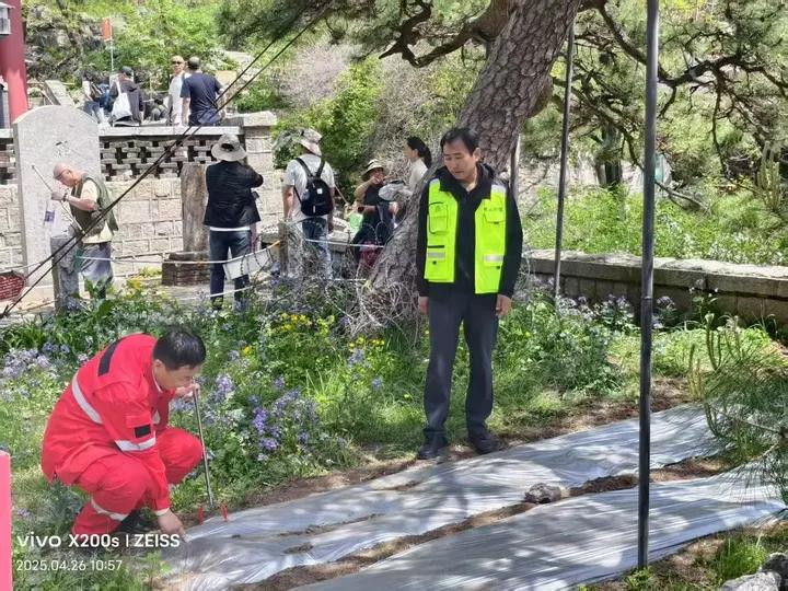 针对五大夫松树冠下层透光率低,光合作用弱的情况,中天门管理区组织专业人员在古松树盘周围铺设反光膜,可以从地面向上反光,使树冠下层和背阴面都能接受反射光,提高树冠中下层和内膛的光照强度,使这些部位的针叶得到充足的光照,从而达到提高光合作用,提高树势的目的。